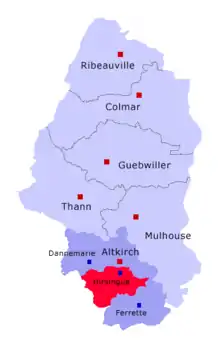 ![]() Représentation du canton de Hirsingue au sein de l'arrondissement d'Altkirch et du département du Haut-Rhin. |