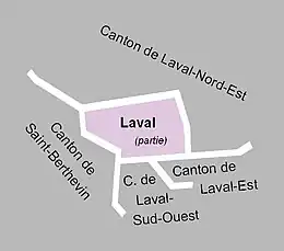 La portion de Laval incluse dans ce canton était « déterminée par les limites territoriales des communes de Saint-Berthevin et de Changé, l'axe de la rivière la Mayenne de la limite de la commune de Changé jusqu'au pont Aristide-Briand et l'axe des voies ci-après : place du 11-Novembre, rue du Général-de-Gaulle et rue de Bretagne[7] ».