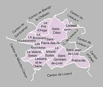 À la suite du redécoupage des cantons pour 2015, toutes les communes à l'exception de Lisieux sont rattachées au nouveau canton de Mézidon-Canon. Lisieux est entièrement intégré au nouveau canton de Lisieux.