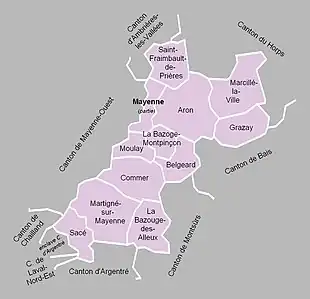 À la suite du redécoupage des cantons pour 2015, les communes d'Aron, La Bazoge-Montpinçon, Belgeard, Commer, Grazay, Marcillé-la-Ville, Martigné-sur-Mayenne, Moulay et Saint-Fraimbault-de-Prières sont rattachées au canton de Lassay-les-Châteaux, la commune de La Bazouge-des-Alleux à celui d'Évron, la commune de Mayenne entièrement à celui de Mayenne et la commune de Sacé à celui de Bonchamp-lès-Laval.