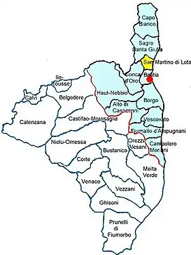 Localisation du canton de San-Martino-di-Lota avant 2015 (en jaune) dans l'arrondissement de Bastia (en bleu).