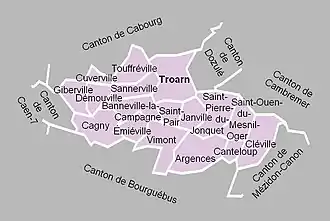 Les anciennes communes suivantes étaient incluses dans le territoire du canton de Troarn antérieur à 2015[27] (voir aussi l'historique des limites cantonales ci-dessus) :