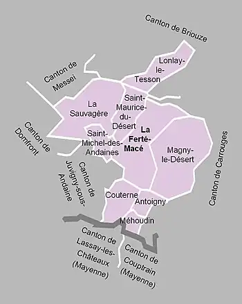 À la suite du redécoupage des cantons pour 2015, la commune de Couterne est rattachée au canton de Bagnoles-de-l'Orne, les communes de La Ferté-Macé, Lonlay-le-Tesson, Saint-Maurice-du-Désert, Saint-Michel-des-Andaines et La Sauvagère à nouveau à celui de La Ferté-Macé  auquel s'ajoutent une commune du canton de Carrouges et neuf du canton de Messei  et les communes d'Antoigny, Magny-le-Désert et Méhoudin à celui de Magny-le-Désert.