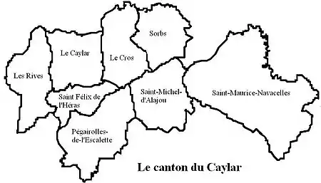 | Le Caylar (chef-lieu) | 34064 | CC Lodévois et Larzac | 22,08 | 444 (2014) | 20