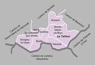 À la suite du redécoupage des cantons pour 2015, les communes de Buais, Saint-Symphorien-des-Monts et Savigny-le-Vieux sont rattachées au canton de Saint-Hilaire-du-Harcouët et les communes de Ferrières, Heussé, Husson, Sainte-Marie-du-Bois et Le Teilleul à celui du Mortainais.