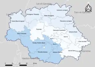 | Arrondissement d'Auch (12 cantons) | Canton d'Auch-Nord-Est - Canton d'Auch-Nord-Ouest - Canton d'Auch-Sud-Est-Seissan - Canton d'Auch-Sud-Ouest - Canton de Cologne - Canton de Gimont - Canton de l'Isle-Jourdain - Canton de Jegun - Canton de Lombez - Canton de Samatan - Canton de Saramon - Canton de Vic-Fezensac |