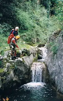Ces canyons étant très peu parcourus, l’équipement[2] en place est généralement très vétuste, voire inexistant. Il est donc impératif de maîtriser l’installation de points d’amarrages[3] et de disposer d’une bonne réserve de corde à couper[4] ou de sangle afin de pouvoir mettre en place des amarrages naturels[5]. Cette activité peut paraître rebutante mais présente un aspect aventureux séduisant, et peut permettre de se faire la main sur place pour les travaux d’équipement avant d’aller ouvrir des canyons vierges dans des contrées reculées.