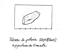 - Poteries à pâte jaune clair. C'est une pâte rayable à l'ongle et contenant des paillettes de mica. Cette poterie semble ne pas avoir subi de cuisson. Les débris sont souvent informes.