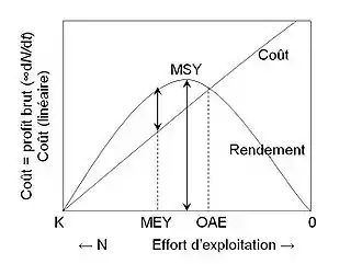 La figure 3 illustre les quatre définitions utilisées en écologie appliquée. La courbe du rendement montre une augmentation initiale et une décroissance jusqu’à la valeur zéro après un sommet aux environs de 0,5. Le rendement équivaut au surplus de production qui se traduit en profit brut. Ce dernier varie en fonction du taux de croissance de l’organisme exploité. Le coût d’exploitation augmente linéairement avec l’effort d’exploitation. Sur l’abscisse, l’effort d’exploitation augmente en direction de la droite. La taille de la population augmente vers la gauche, le maximum étant situé au point , soit la capacité porteuse. Le point est aussi le point où le taux d’exploitation est nul. Le rendement équilibré maximal (MSY) se produit à 0,5. Le rendement économique équilibré maximal (MEY) correspond au profit net et se produit lorsque les pentes du coût et du rendement sont parallèles. Le rendement à l’équilibre à l’accès libre (OAE) se produit lorsque le profit brut équivaut au coût[1].