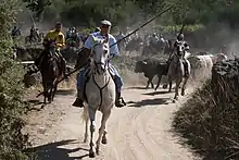 Un vaste déplacement commence dans les champs près de la frontière espagnole. Objectif : aller chercher les taureaux choisis pour l'événement. Des cavaliers choisis parmi les meilleurs font démonstration de leur art de monter et escortent les taureaux jusqu'à la place du village ou l’arène, pour l’ « Encerro », la « fermeture ». Le temps de cette « escorte des taureaux » varie selon l'habileté des cavaliers et le comportement des animaux.