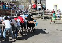 Parfois, un homme se jette à la tête du taureau. En quelques secondes, des hommes viennent de partout pour aider l'aventurier, immobilisant immédiatement le taureau par la force humaine. Après quelques secondes dans cette posture, le taureau est relâché et les hommes se précipitent pour s'échapper vers les barrières, afin d'éviter d'être victimes d'une corne. Il ne reste qu'un homme qui saisit fermement la queue du taureau pour que les autres puissent être en sécurité, attendant le bon moment pour qu'il puisse faire de même. Après cette tâche, le taureau est conduit vers les corrals.