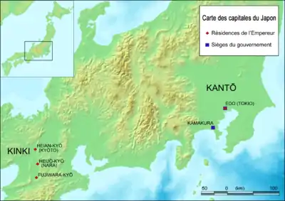 | 45 | 30 | Fujiwara-kyō | 697-707 | 42 | Empereur Monmu | Palais de Fujiwara | |