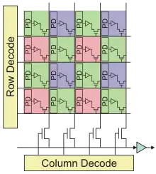 De la même façon que beaucoup de CCD, les capteurs CMOS pour image couleur sont associés à un filtre coloré et un réseau de lentilles, encore plus nécessaire vu la faible surface relative de la photodiode, seule zone sensible.
