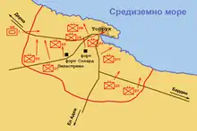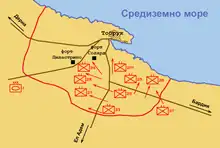 Le matin du 5 janvier, alors que les forces australiennes nettoyaient toujours la zone sud de Bardia, Wavell ordonna à la 7e brigade blindée de la 7e division blindée d'avancer vers l'ouest, de passer Tobrouk afin d'isoler la ville. Le 6 janvier, la brigade avait atteint El Adem (aujourd'hui l'aéroport de Tobrouk). Le 7 janvier, le gros des forces britanniques était arrivé et avait isolé Tobrouk[4]. Le groupe de la 19e brigade australienne se plaça en face des défenses orientales de Tobrouk tandis que le groupe de la 16e brigade australienne prit le relais du côté ouest. La 4e brigade blindée fut déployée vers l'ouest de la ville, le 7e groupe de soutien bloqua les sorties ouest et la 7e brigade blindée protégea la force des interférences de l'ouest.