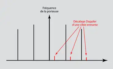 Considérons le décalage positif d'une cible entrante sur le diagramme qui a été considérablement simplifié pour être clair. On peut observer que lorsque augmente, on atteint un point où les raies spectrales qui constituent les échos sont cachées ou intermodulées par la bande latérale suivante de la porteuse modulée (repliement de spectre). Pour lever cette ambigüité, on émet plusieurs paquets d'impulsions avec des différentes, ainsi à chaque nouvelle valeur de correspondra une nouvelle position de la bande latérale exprimant par rapport au récepteur. La vitesse maximale mesurable sans ambigüité est donnée par :