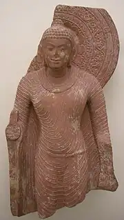 sans cavalier ou un parasol. Plus tard, des traditions iconiques se sont développées dans les régions du Gandhara (aujourd'hui la région de Kandahar, en Afghanistan) et celle de Mathura, où l'on a trouvé les premières statues de Bouddha, dont la facture est imprégnée d'art gréco-bouddhique[5],[Note 1]. Certaines des caractéristiques ont joué un rôle important dans l'iconographie des bouddhas, en particulier l'ūrṇā et l'ushnīsha et le corps moulé par le vêtement; on rencontre souvent aussi les roues sur la paume des mains ou la plante des pieds, ainsi que l'auréole qui entoure la tête ou le corps du Bouddha[4].