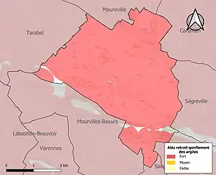 Le retrait-gonflement des sols argileux est susceptible d'engendrer des dommages importants aux bâtiments en cas d’alternance de périodes de sécheresse et de pluie. 98,4 % de la superficie communale est en aléa moyen ou fort (88,8 % au niveau départemental et 48,5 % au niveau national). Sur les 105 bâtiments dénombrés sur la commune en 2019, 105 sont en aléa moyen ou fort, soit 100 %, à comparer aux 98 % au niveau départemental et 54 % au niveau national. Une cartographie de l'exposition du territoire national au retrait gonflement des sols argileux est disponible sur le site du BRGM[26],[Carte 3].