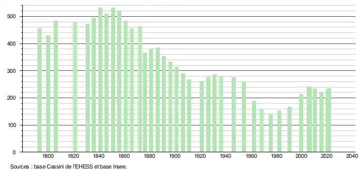 L'évolution du nombre d'habitants est connue à travers les recensements de la population effectués dans la commune depuis 1793. Pour les communes de moins de 10 000 habitants, une enquête de recensement portant sur toute la population est réalisée tous les cinq ans, les populations légales des années intermédiaires étant quant à elles estimées par interpolation ou extrapolation[30]. Pour la commune, le premier recensement exhaustif entrant dans le cadre du nouveau dispositif a été réalisé en 2005[31].