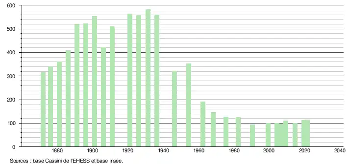 L'évolution du nombre d'habitants est connue à travers les recensements de la population effectués dans la commune depuis 1872. Pour les communes de moins de 10 000 habitants, une enquête de recensement portant sur toute la population est réalisée tous les cinq ans, les populations légales des années intermédiaires étant quant à elles estimées par interpolation ou extrapolation[9]. Pour la commune, le premier recensement exhaustif entrant dans le cadre du nouveau dispositif a été réalisé en 2004[10].