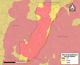 Le retrait-gonflement des sols argileux est susceptible d'engendrer des dommages importants aux bâtiments en cas d’alternance de périodes de sécheresse et de pluie. La totalité de la commune est en aléa moyen ou fort (67,4 % au niveau départemental et 48,5 % au niveau national). Sur les 2 420 bâtiments dénombrés sur la commune en 2019, 2 420 sont en aléa moyen ou fort, soit 100 %, à comparer aux 84 % au niveau départemental et 54 % au niveau national. Une cartographie de l'exposition du territoire national au retrait gonflement des sols argileux est disponible sur le site du BRGM[24],[Carte 2].