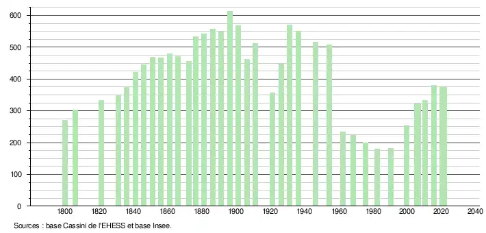 L'évolution du nombre d'habitants est connue à travers les recensements de la population effectués dans la commune depuis 1800. Pour les communes de moins de 10 000 habitants, une enquête de recensement portant sur toute la population est réalisée tous les cinq ans, les populations légales des années intermédiaires étant quant à elles estimées par interpolation ou extrapolation[9]. Pour la commune, le premier recensement exhaustif entrant dans le cadre du nouveau dispositif a été réalisé en 2005[10].