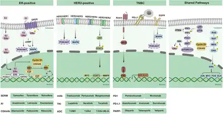 Les voies les plus importantes reconnues dans le cancer du sein, notamment la voie du récepteur des œstrogènes[47], la voie de signalisation HER2[48],[49], la voie de signalsation PI3K/AKT/mTOR[50],la voie MAPK[50],[51] et la voie cycline D1/kinase dépendante de la cycline 4/6/protéine du rétinoblastome (cycline D1/CDK4/6/RB1).
