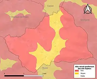 Le retrait-gonflement des sols argileux est susceptible d'engendrer des dommages importants aux bâtiments en cas d’alternance de périodes de sécheresse et de pluie. La totalité de la commune est en aléa moyen ou fort (67,4 % au niveau départemental et 48,5 % au niveau national). Sur les 225 bâtiments dénombrés sur la commune en 2019, 225 sont en aléa moyen ou fort, soit 100 %, à comparer aux 84 % au niveau départemental et 54 % au niveau national. Une cartographie de l'exposition du territoire national au retrait gonflement des sols argileux est disponible sur le site du BRGM[18],[Carte 2].