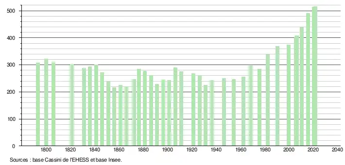 | L'évolution du nombre d'habitants est connue à travers les recensements de la population effectués dans la commune depuis 1793. Pour les communes de moins de 10 000 habitants, une enquête de recensement portant sur toute la population est réalisée tous les cinq ans, les populations légales des années intermédiaires étant quant à elles estimées par interpolation ou extrapolation[25]. Pour la commune, le premier recensement exhaustif entrant dans le cadre du nouveau dispositif a été réalisé en 2005[26]. En 2021, la commune comptait 515 habitants[Note 3], en augmentation de 4,89 % par rapport à 2015 (Gironde : +6,88 %, France hors Mayotte : +1,84 %). |