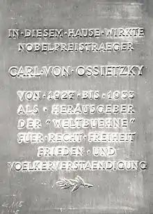 En tant qu'éditeur du magazine Die Weltbühne (La Scène mondiale), il fut condamné en 1931 pour haute trahison pour avoir publié des informations sur le réarmement clandestin de l'Allemagne. Ossietzky obtint en 1936 le prix Nobel de la paix au titre de l'année 1935 pour ses publications.