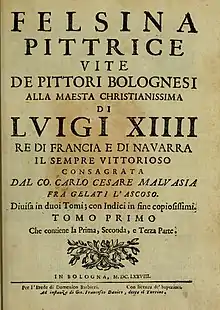 - Felsina pittrice, vite e ritratti de’ pittori Bolognesi, Bologne, 1678, 2 vol. in-4°, fig[3]. L’auteur a dédié cet ouvrage à Louis XIV, qui lui fit présent de son portrait enrichi de diamants. Il est divisé en quatre parties : la première contient des recherches sur les peintres qui ont travaillé à Bologne avant la Renaissance ; la seconde, l’origine et l’histoire de l’école de peinture de cette ville, avec l’indication des principaux tableaux des maîtres qui l’ont illustrée ; la troisième, les vies des Carracci et des artistes contemporains ; et la quatrième enfin, celles du Guide, du Dominiquin, de l’Albane, etc. La préférence que Malvasia donne à l’école de Bologne sur toutes celles d’Italie et son injustice à l’égard de Raphaël excitèrent les plus vives réclamations. Vasari, dont il semble prendre à tâche de contredire tous les jugements, fut défendu par Philippe Baldinucci, dans ses Notizie de’ professori, et surtout dans le dialogue La veglia (La veillée). Vincenzo Vittoria vengea Raphaël et l’école romaine par ses Osservazioni sopra il libro della Felsina, etc., Rome, 1713, in-8°. Giampietro Zanotti prit la défense de l’ouvrage de Malvasia, son compatriote et son ami, et répliqua aux observations de Vittoria.
