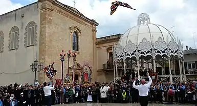 Il se compose de deux drapeaux multicolores dans le jeu, qui sont faites à la vague, tourner autour du cou, les jambes et le ventre et lancé dans l'air. Tout cela se fait en l'honneur de Maria Santissima du Belvédère.
