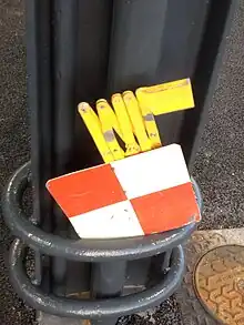 En signalisation mécanique, il est présenté sous forme d'une cocarde (tableau) à damier rouge et blanc.