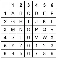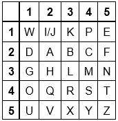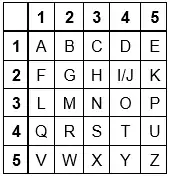 Le principe est assez[évasif] simple : il consiste à ordonner les lettres de l’alphabet en ordre alphabétique dans un tableau carré de 5 cases de côté dont chaque ligne et chaque colonne sont numérotées, de gauche à droite et de haut en bas. Considérant que l’alphabet français comporte 26 lettres et que le carré possède seulement 25 cases, par convention les lettres i et j sont fusionnées — comme dans l’image ci-contre. Parfois, d’autres lettres sont fusionnées à la place de celles-ci comme x et z ou encore c et k.