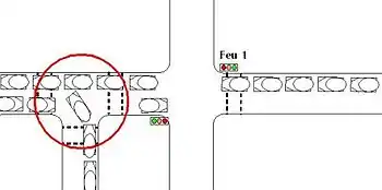 - Tourne-à-Gauche : mouvement consistant pour les véhicules à tourner à gauche dans le carrefour. Ce mouvement est le plus complexe à gérer puisqu'il croise le mouvement direct face auquel il n'a pas la priorité et le tourne-à-gauche du sens opposé. Le coefficient d'équivalence est très variable et dépend essentiellement du débit et du nombre de mouvements antagonistes prioritaires. Le coefficient peut ainsi généralement varier de 1,1 à 1,7. Plus le cycle est court, plus le coefficient du tourne à gauche sera faible.
