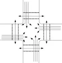 - Tourne-à-Gauche à l'indonésienne : mouvement dans lequel les tourne-à-gauche ne sont pas antagonistes. Les tourne-à-gauche à l'indonésienne s'accompagnent souvent d'une voie de stockage dédiée au tourne-à-gauche.