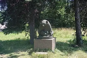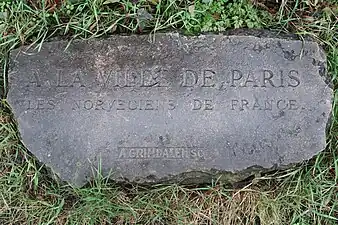 Y est installée une statue d'ours, sous laquelle une plaque indique : « À la ville de Paris. Les Norvégiens de France. A. Grimdalen ».