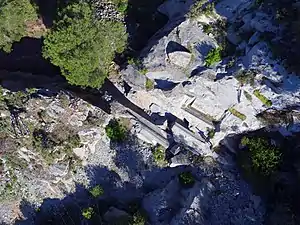 L'accès s'effectue par un chemin d’exploitation creusé à même la roche offrant un magnifique point de vue sur la plaine de l’Aude, les Corbières et les Pyrénées. Il débouche sur une plateforme, ancienne carrière remblayée par les rebuts d’exploitations postérieures. En dessous de cette aire de retournement des charrois et des camions, on distingue dans le lit d’une ancienne cascade de très anciennes traces d’outils. L’esplanade se prolonge au Nord par une carrière en amphithéâtre et sur le côté Est d’un talweg qui suit le pendage des couches de marbres. La société Zealodrone a estimé en 2017 le volume de marbre extrait de cette carrière principale à environ 13 400 m3. Au dessus de cette carrière, trois autres carrières ont été récemment mises à jour.