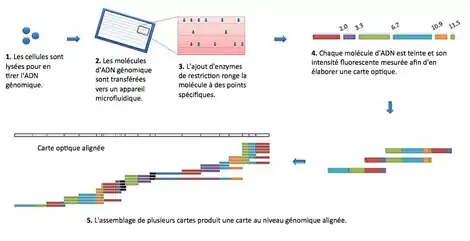 - L'ADN génomique est tiré des cellules lysées et cisaillé au hasard afin de produire un fonds de grandes molécules génomiques propres à la cartographie optique[4].