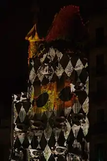 La partie supérieure, un peu en retrait par rapport à la rue, est une sorte de crête faite de céramiques colorées qui suscita de multiples interprétations[53]. La partie centrale, du second au dernier étage, est faite d'un tapis multicolore d'où sortent les balcons. La partie inférieure (le rez-de-chaussée, le premier étage et deux galeries du second étage) est en grès de Montjuïc et présente des formes ondulées[53].