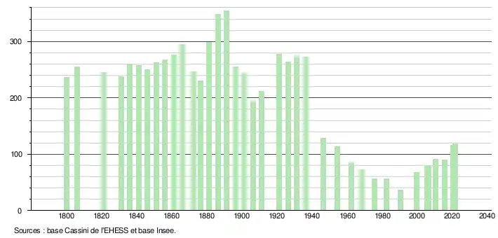L'évolution du nombre d'habitants est connue à travers les recensements de la population effectués dans la commune depuis 1800. Pour les communes de moins de 10 000 habitants, une enquête de recensement portant sur toute la population est réalisée tous les cinq ans, les populations légales des années intermédiaires étant quant à elles estimées par interpolation ou extrapolation[7]. Pour la commune, le premier recensement exhaustif entrant dans le cadre du nouveau dispositif a été réalisé en 2005[8].