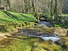 - La partie basse : le ruisseau dévale ensuite la pente boisée sur une centaine de mètres de dénivelé jusqu'à la Loue, formant plusieurs cascades couvertes de tuf.