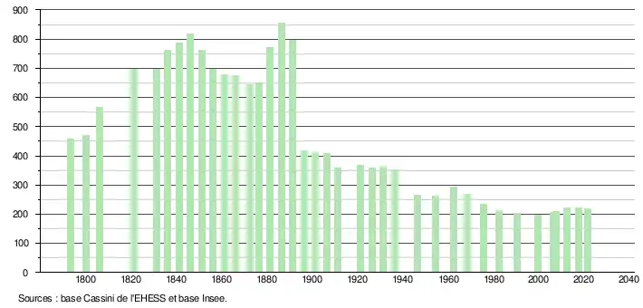 L'évolution du nombre d'habitants est connue à travers les recensements de la population effectués dans la commune depuis 1793. Pour les communes de moins de 10 000 habitants, une enquête de recensement portant sur toute la population est réalisée tous les cinq ans, les populations légales des années intermédiaires étant quant à elles estimées par interpolation ou extrapolation[32]. Pour la commune, le premier recensement exhaustif entrant dans le cadre du nouveau dispositif a été réalisé en 2007[33].