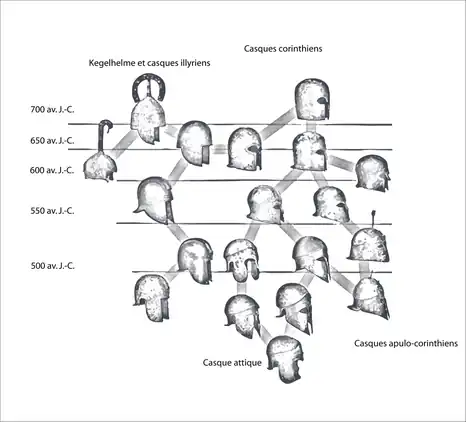 Le VIIe siècle av. J.-C. est marqué notamment par la distinction qui s’installe progressivement entre le casque corinthien et le casque illyrien, ce dernier présentant deux crêtes parallèles sur le sommet de la calotte, et des paragnathides plus prononcée et descendant plus bas sous la mandibule. Cependant, à contrario du casque corinthien, l'illyrien laisse le visage découvert.