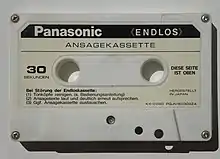 La cassette à bande sans fin[1] est dotée d'un transport de bande qui ne permet qu'un mouvement vers l'avant. La bande magnétique peut comporter des marqueurs de début et de fin, tels qu'une balise magnétique, une épissure conductrice d'électricité ou un trou qui peut être scanné par optique. La cassette a été inventée par l'ingénieur du son Bernard A. Cousino et a dominé le marché nord-américain pendant de nombreuses années[2].