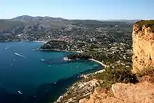 Vue aérienne de Cassis vers le Sud, avec le cap Canaille à gauche et les calanques à droite.