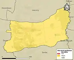 Le retrait-gonflement des sols argileux est susceptible d'engendrer des dommages importants aux bâtiments en cas d’alternance de périodes de sécheresse et de pluie. La totalité de la commune est en aléa moyen ou fort (44,5 % au niveau départemental et 48,5 % au niveau national). Sur les 97 bâtiments dénombrés sur la commune en 2019, 97 sont en aléa moyen ou fort, soit 100 %, à comparer aux 75 % au niveau départemental et 54 % au niveau national. Une cartographie de l'exposition du territoire national au retrait gonflement des sols argileux est disponible sur le site du BRGM[19],[Carte 2].