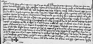 La mention de « collaco » est visible en haut à gauche de l’hommage, le nom de « Guiraldus de Cartlat » se trouve au centre de la première ligne, la mention du « castrum sive reparium de collacho » (« château ou repaire de Calhac ») à cheval sur la troisième et la quatrième ligne, et la localisation « entre Senec e Brocme » juste en dessous. La date de l’acte a été précisée ultérieurement à la rédaction de l’hommage, en chiffres arabes, à la fin du texte : « 1266 ». Guiraldus possède également, d’après son hommage, une exploitation agricole aux Mazials, lieu-dit à 4 km au sud de Calhac, après Cussac, et une ferme au Pouget « fazenda del Poget » à 6 km du château, près du village de Brommat.