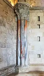 Le plan d'appui de la voûte est souligné par une corniche, soutenue par le chapiteau au sommet des colonnes porteuses. La communication entre l'étage inférieur et l'étage supérieur est assurée par les escaliers en colimaçon, qui ne sont pas présents dans chacune des huit tours. Ces escaliers montent dans le sens inverse des aiguilles d'une montre. Ils comprennent chacun 44 marches trapézoïdales, chacune constituée d'une pierre d'un seul tenant, qui émergent d'une colonne centrale d'un diamètre d'environ 22 cm.