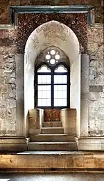 On pense qu'au centre de cette cour, il a déjà existé un bassin, également octogonal, fabriqué en marbre d'une seule pièce, selon la description de Troyli en 1743[6]. Une des nombreuses légendes veut que ce bassin ait représenté le Saint Graal[7] qui, suivant certaines légendes, aurait été abrité pendant un moment dans l'édifice.