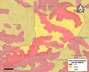 Le retrait-gonflement des sols argileux est susceptible d'engendrer des dommages importants aux bâtiments en cas d’alternance de périodes de sécheresse et de pluie[19]. La totalité de la commune est en aléa moyen ou fort (91,8 % au niveau départemental et 48,5 % au niveau national)[Carte 2]. Depuis le , en application de la loi ELAN, différentes contraintes s'imposent aux vendeurs, maîtres d'ouvrages ou constructeurs de biens situés dans une zone classée en aléa moyen ou fort[Note 4],[20].